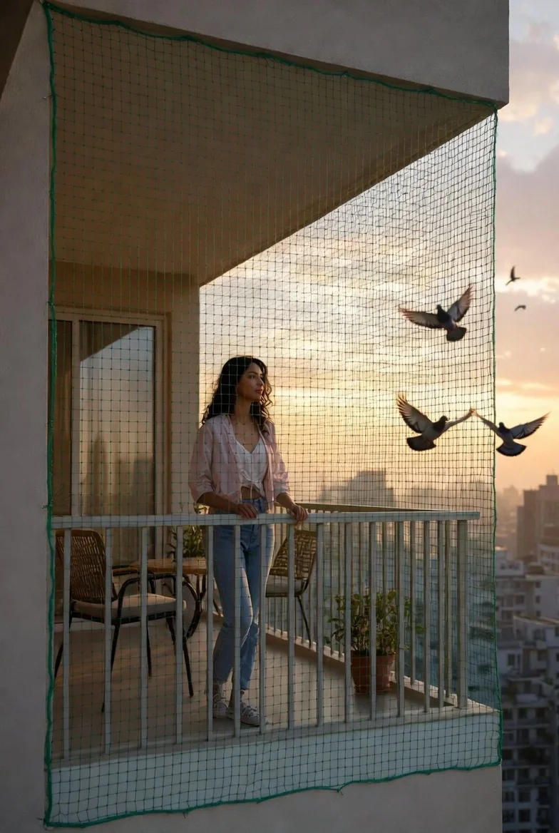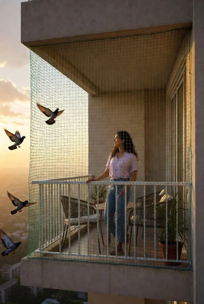 Our Anti-Bird Nets are strong, durable, UV-resistant, and blend perfectly with the balcony structure while allowing natural airflow and light.